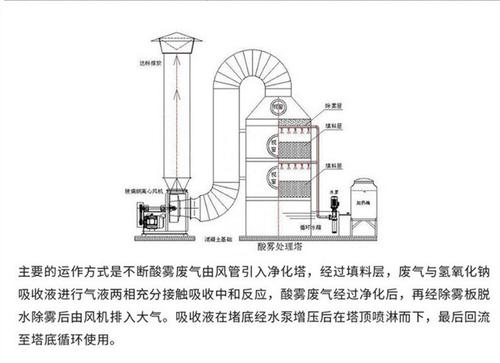 排除的酸霧廢氣→進(jìn)入風(fēng)管→經(jīng)過酸堿廢氣處理塔→風(fēng)機(jī)→風(fēng)管→達(dá)標(biāo)排放。